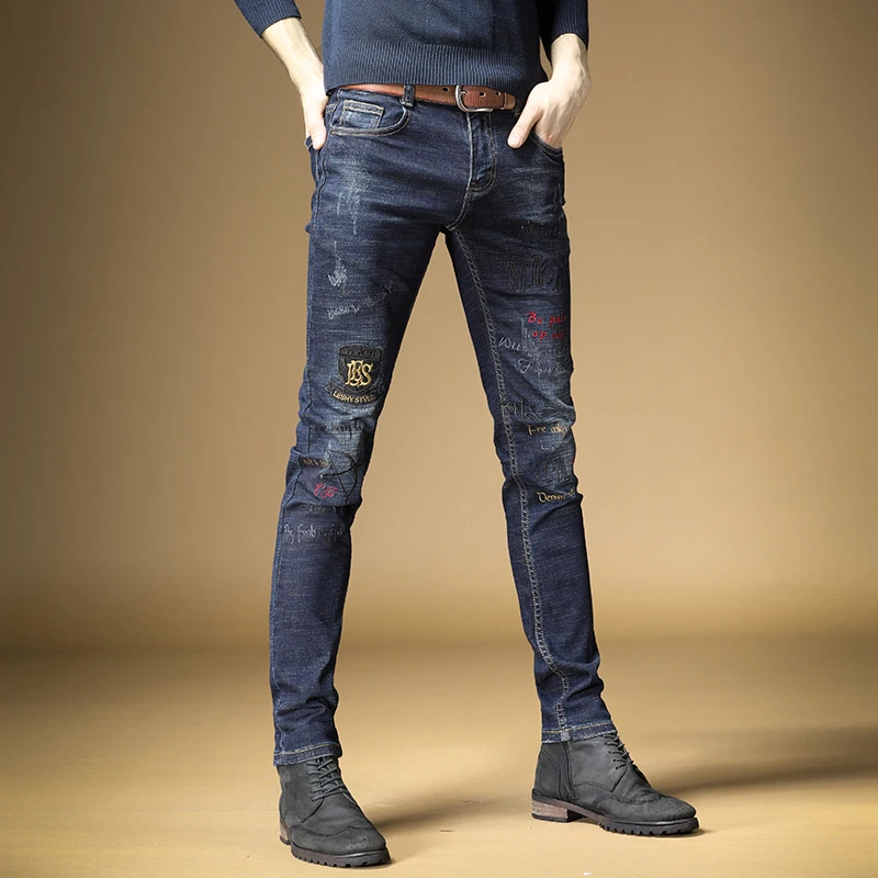 Product Name (RU) : Fashion Men Embroidery Blue Jeans Streetwear Stretch Denim Trousers Straight Slim Fit Pants